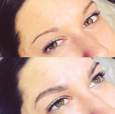 A soft, pixelated brow created using a machine for a shaded, makeup-like effect. Great for all skin types — especially oily or mature — and for those who prefer a more filled-in look.